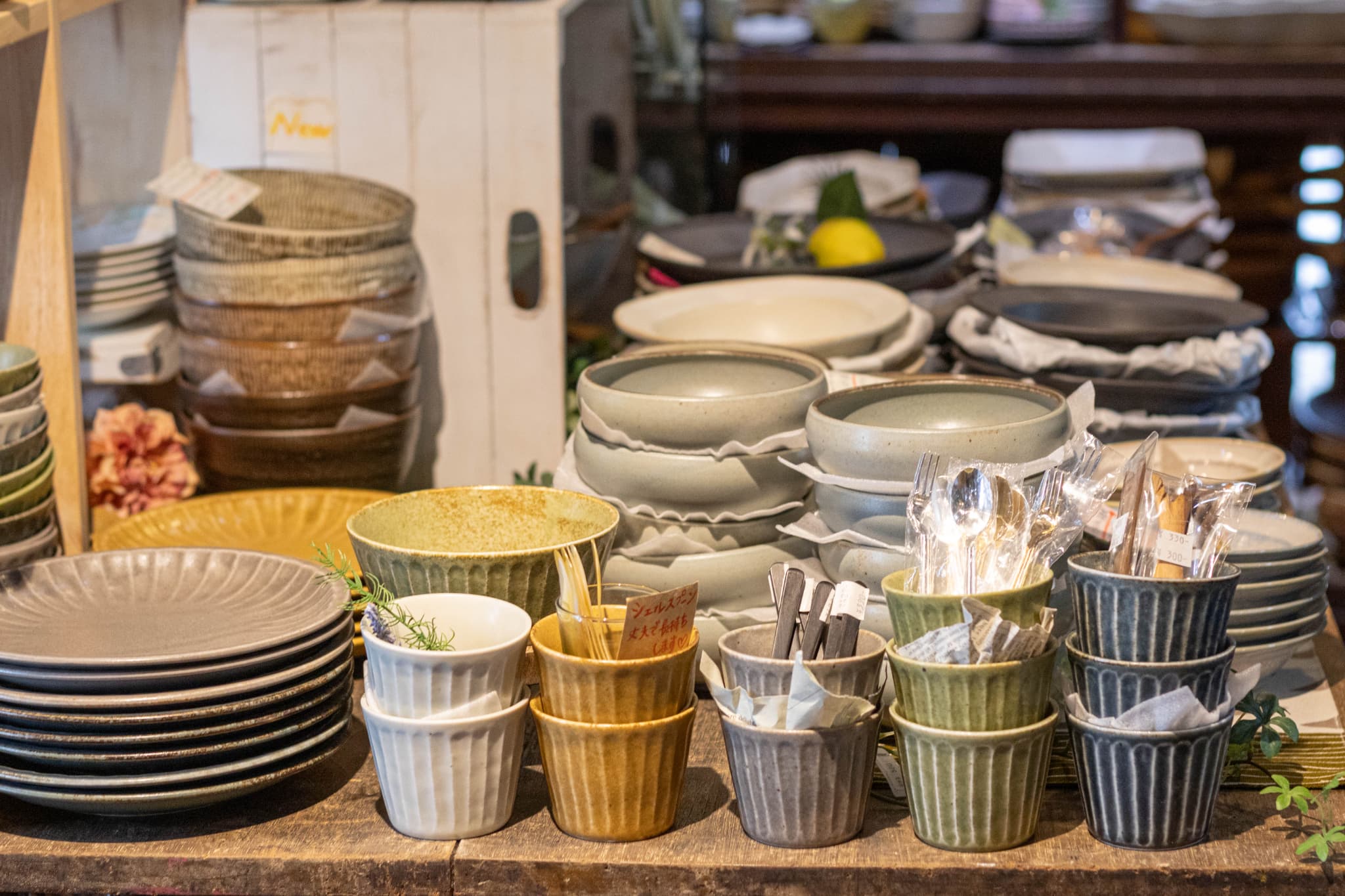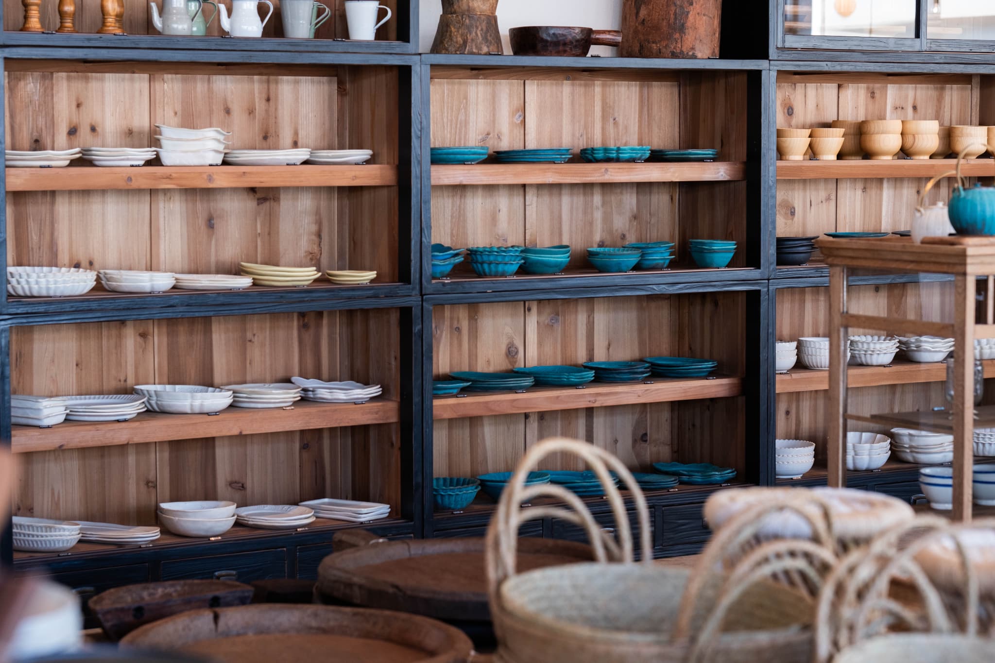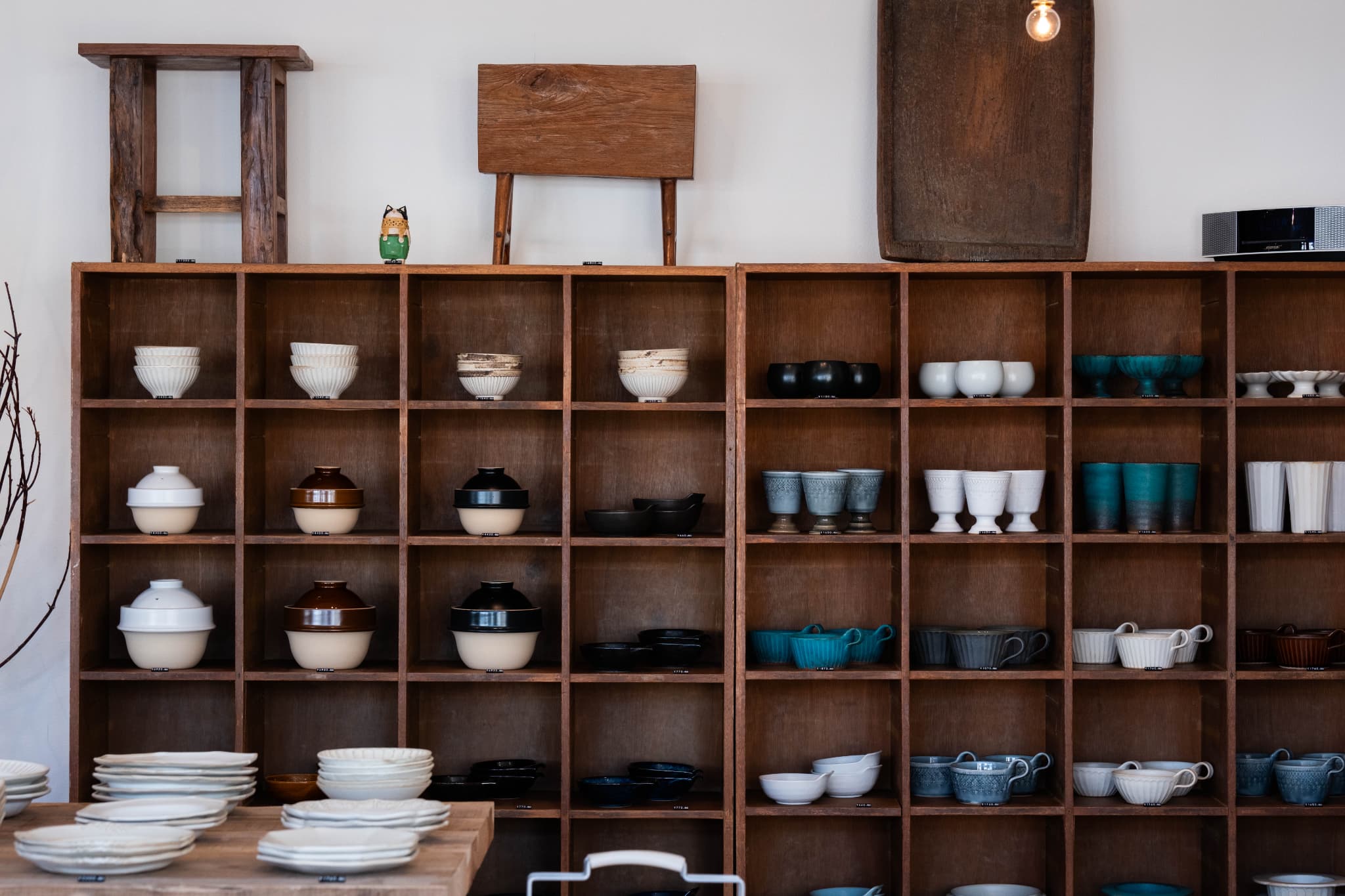その隣にある小さな建物が、主に窯元の器を扱う「Rim.」です。店内には、益子焼や美濃焼、珉平焼(みんぺいやき)など、それぞれの窯元の特徴や魅力がある、実用性の高い器が並びます。それぞれの見どころと魅力があるふたつのお店です。