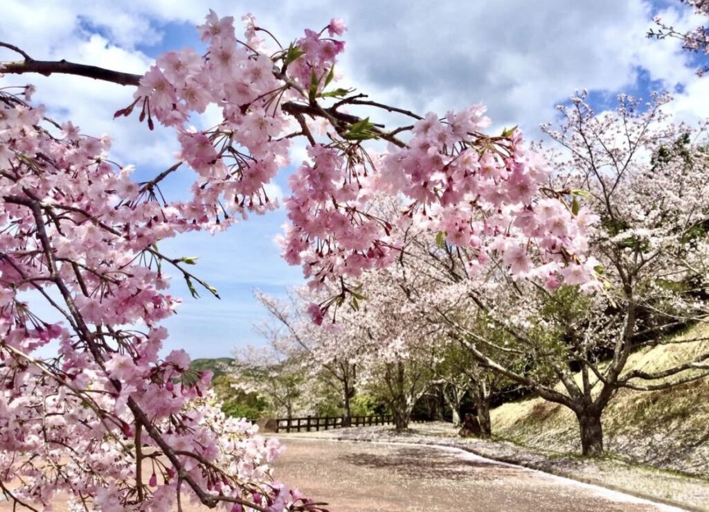 寺山いこいの広場から永利町側に向かうと、見事な桜が広がっています。高台からは桜の向こうに広がる東シナ海や薩摩川内の街並みを一望でき、青い空とピンクの桜のコントラストは歓声が上がる美しさ。まさに春ならではの絶景が広がります。