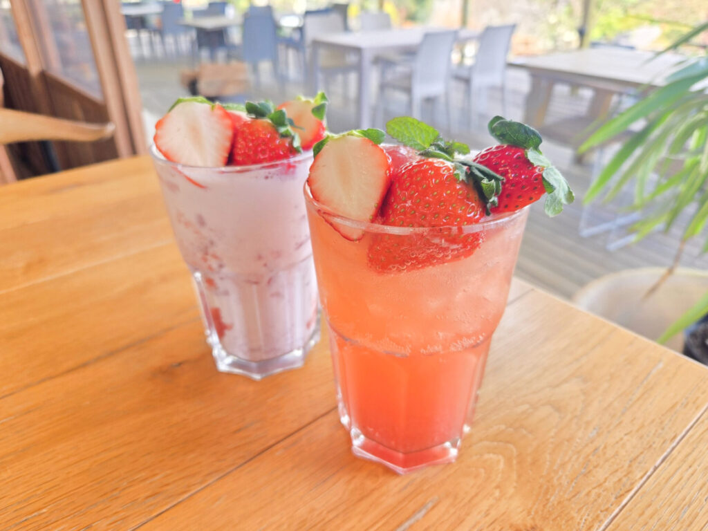 その他には、炭酸ベースの爽やかなオリジナルドリンクの「いちごスパークリングフロート」や、手作りにイチゴソースを牛乳で割った「いちごミルクフロート」が。どれも自家農園産のイチゴの果実感と味を生かした甘さです。