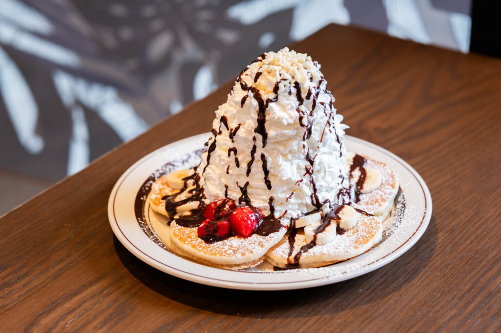 創業当時から親しまれてきたパンケーキは、5枚重ねのパンケーキの上に、約15cmものオリジナルホイップクリームをのせた、インパクト抜群の一皿です。見た目のボリュームとは裏腹に、ホイップは甘さ控えめであっさり。エスプーマを使っているため、口に入れると泡のように軽く、すっと溶ける食感。