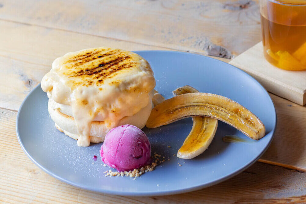 自家製カスタードクリームと砂糖をのせてキャラメリゼした「ブリュレパンケーキ」は、カラメルの香ばしさ、カスタードのやさしい甘さ、そして少し塩みのある生地のバランスが絶妙。パリパリのキャラメリゼと、生地の”ぷるふわっ”食感も楽しめます。(2026年2月の情報です)