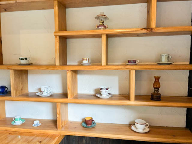 敷地内に立つキャビンもご夫妻の手作りです。中は、カウンターキッチンになっていて、コーヒーを飲みながらのワークショップもできる空間。飾り棚のカップ&ソーサーやランプなど、小物や雑貨も温もりを感じさせます。ゆくゆくはワークショップも開けるように計画中とか。