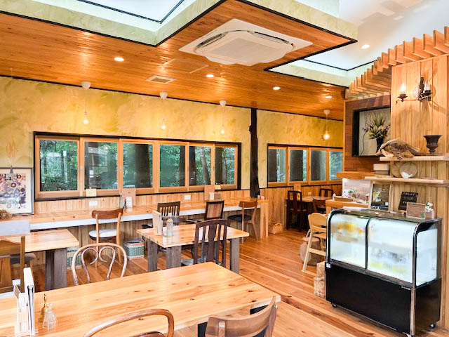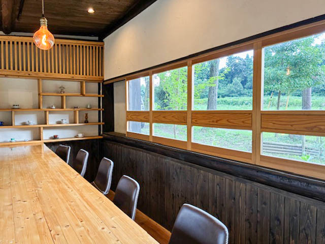 店内の調度品やしっくいの塗り壁、杉林に面して小窓が連なるテーブル席などに心が和みます。落ち着く店内の木のテーブルもご夫妻の手作りです。