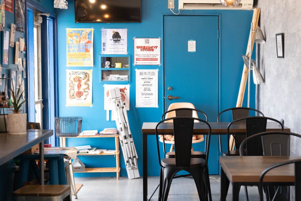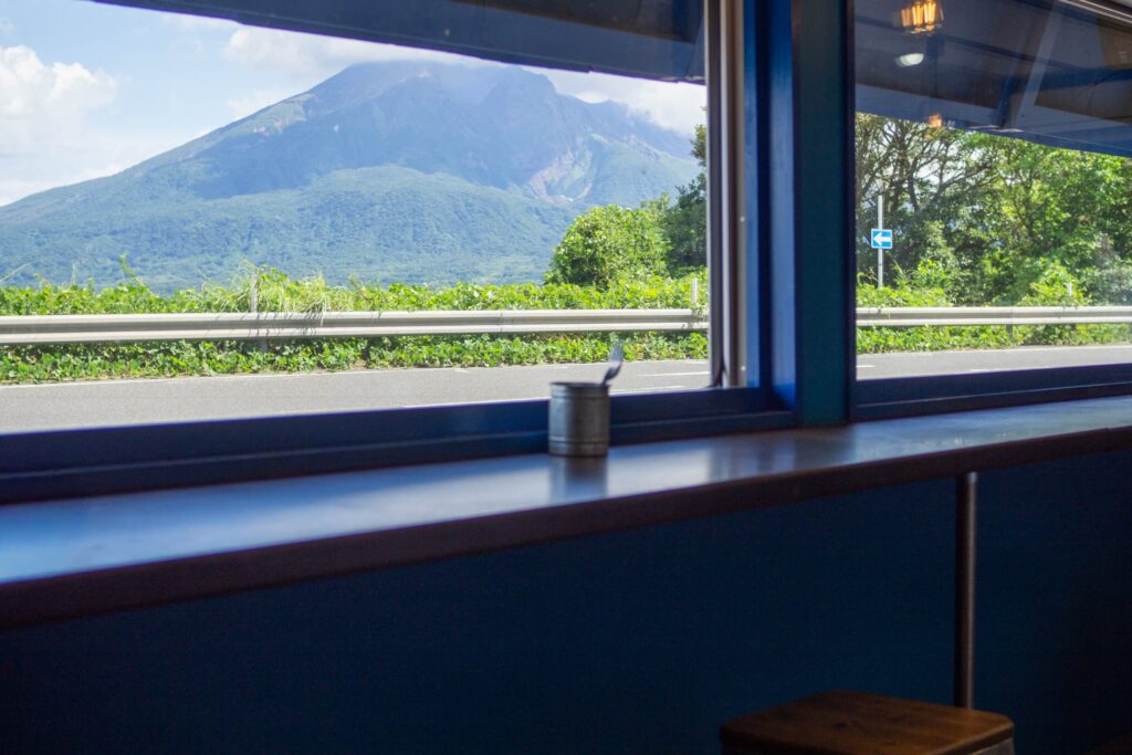 仙巌園から車で4分ほど走ると、青い屋根とグレーの外壁が見えてきます。車を止めて店内に入ると、陽気な音楽が流れる空間が広がり、天気のいい日にはカウンター席から桜島と青空を眺めることができます。