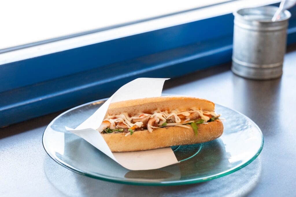香ばしいハード系のパンに、レバーペースト、鶏ハム、紅白なます、水菜を挟み、スイートチリソースとマヨネーズで仕上げた「プレーンバインミー」。