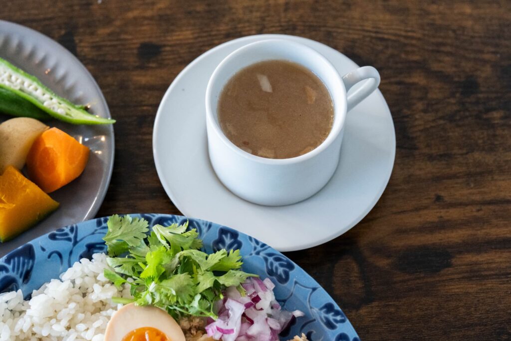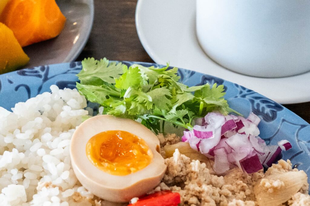 人気のメニュー「ガパオライス」は、香ばしく炒めた鶏ミンチに4種類のスパイスを効かせ、生のスイートバジルとホーリーバジルをちぎって加えて作る本格派。ひと口食べると、鶏肉の旨みに、スパイスとハーブの香りが絡み合い、あと引くおいしさです。仕上げに添えられる紫タマネギとパクチーは、シャキッとした食感と清涼感でアクセントに。この一皿で、日本の家庭料理にはない、異国の香りと味わいを存分に堪能できます。