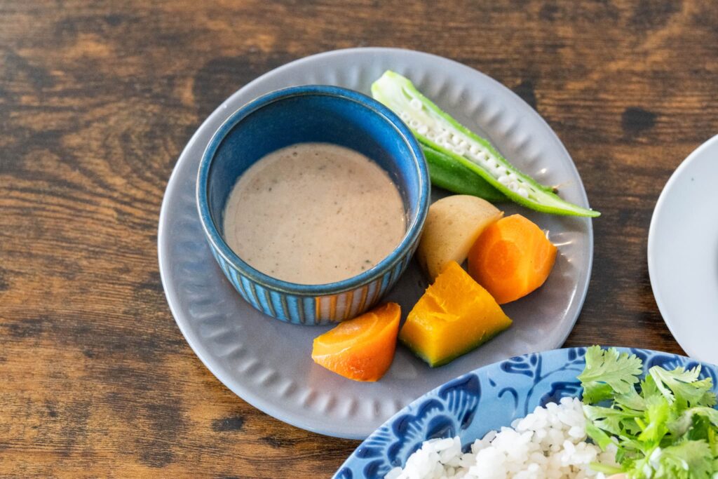 フードメニューには、シンガポール料理の「シンガポールライス」、メキシコ料理の「チリコンカンライス」、タイ料理の「ガパオライス」などがあり、日替わりスープと季節野菜を使った自家製バーニャカウダがセットになっています。