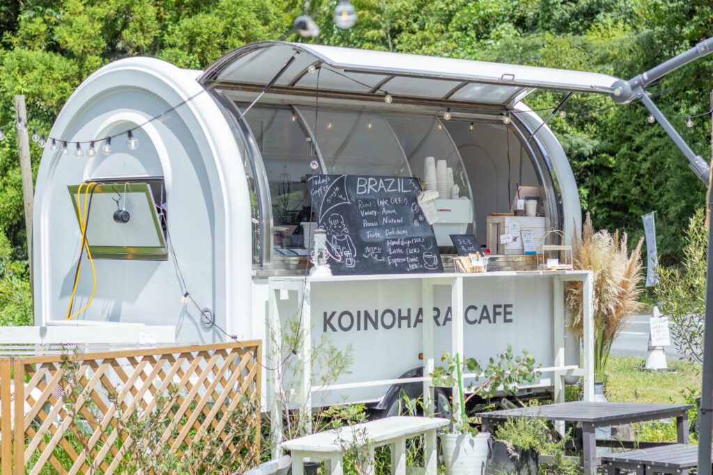 JR伊集院駅から車で約7分。「KOINOHARA CAFE(コイノハラカフェ)」は、自然豊かな日置市恋之原にたたずむトレーラーカフェ。もともと林だった土地を、オーナーの北田さん一家が整え、2024年9月にオープンしました。
