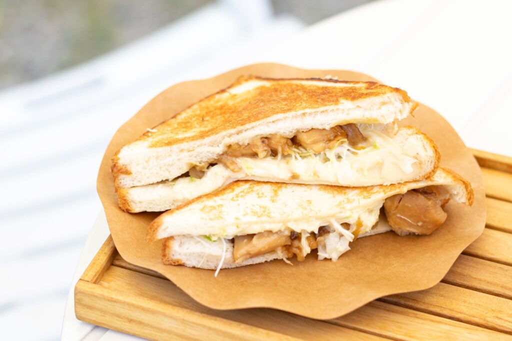 ドリンクと一緒に楽しめる、軽食やスイーツもあります。ホットサンドは照り焼きチキン、ハムチーズ、キーマカレーの3種類。今回は、照り焼きチキンとマヨネーズ、キャベツがサンドされたホットサンドをいただきました。自家製の甘辛タレに漬けこんだ鶏もも肉は、脂身を丁寧に取り除くことでヘルシーに。もも肉のジューシーさを残しつつ、歯切れの良い食感に仕上げています。