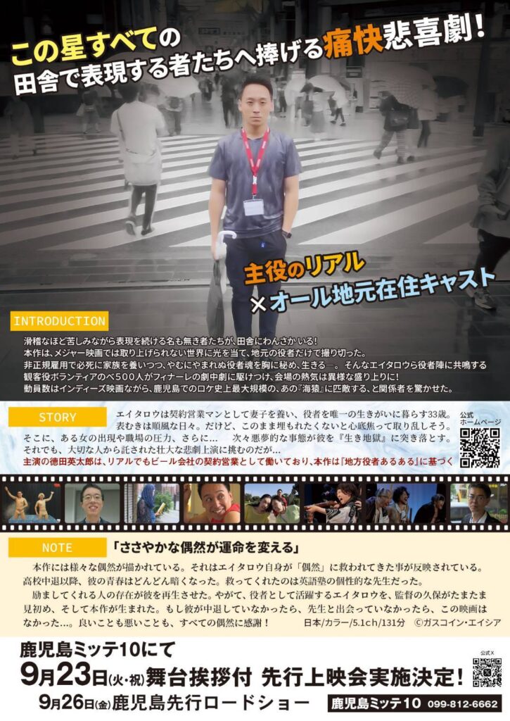 オール鹿児島ロケ&地元在住の役者による、映画『エイタロウ』。9月23日(火・祝)に、鹿児島ミッテ10で行われた「先行上映会」は満席。出演者や監督の舞台挨拶もあり、盛り上がりました。9月26日(金)からは先行ロードショーも開始。