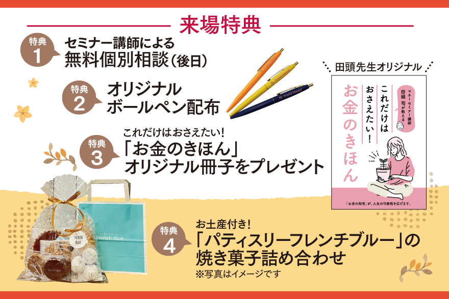 参加費は無料。来場特典でセミナー講師 田頭さんによる無料個別相談(後日)、オリジナル冊子・ボールペン、さらにパティスリーフレンチブルーの焼き菓子詰め合わせをプレゼント。