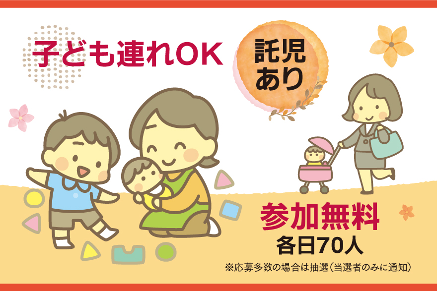 託児もあるので、子ども連れでの参加もOKです。定員は各日70名、応募多数の場合は抽選になります。
