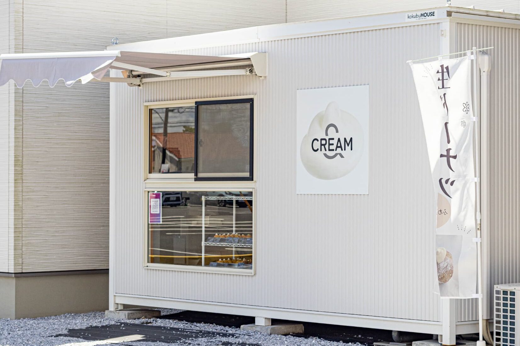 自宅併設型の店舗は、真っ白な外壁に、シンプルなお店のロゴが印象的です。これを背景に、生ドーナツを片手に持って写真を撮る人も。窓際にはさまざまな生ドーナツが並びます。そこからカウンター越しに注文し、商品を受け取るスタイルです。