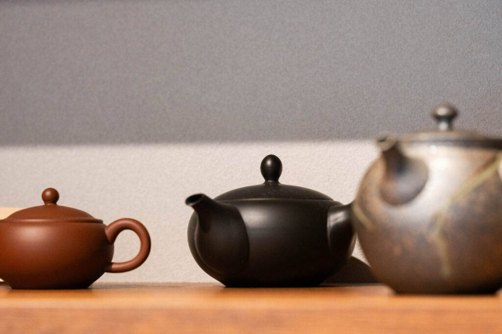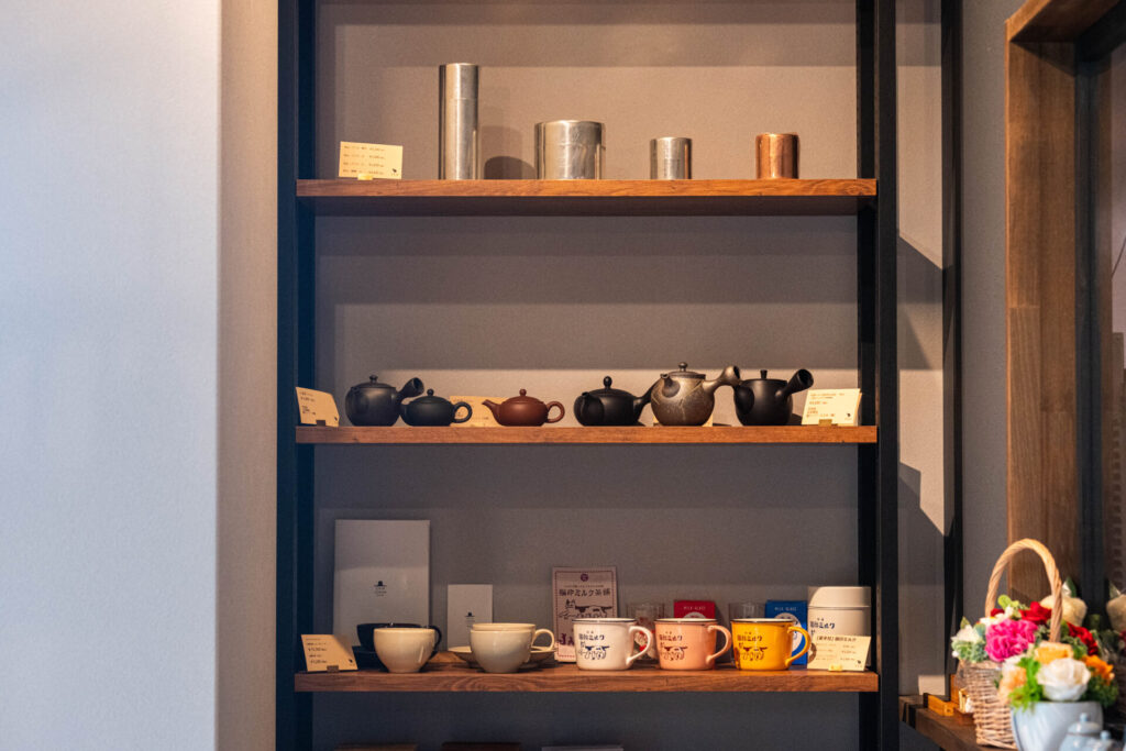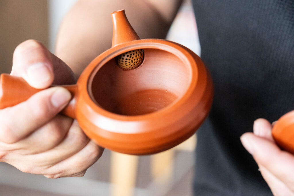店内には、常滑焼(とこなめやき)の急須がずらりと並びます。愛知県常滑市を中心とした知多半島で、約900年の歴史を誇る伝統的な焼き物です。形や大きさはさまざまで、一人用の小さくかわいらしい急須も。持ち手や内側の茶こしにも種類があり、茶葉に合わせて選べます。