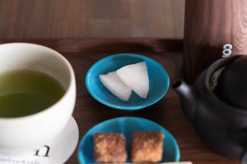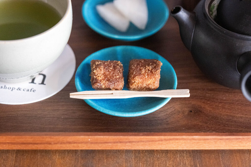 げたんはは、肝属郡錦江町で大正15年創業の「原製菓舗」の名物「ひとくちげたんは」。さくさくとした食感と香ばしい黒糖の風味が、緑茶のまろやかな旨みを引き立てます。添えられた「べったら漬け」は、鹿児島で昔から来客時のお茶請けとして漬物を出す習慣に由来するもの。甘みと塩みを行き来するひとときが、心をほどよく満たしてくれます。