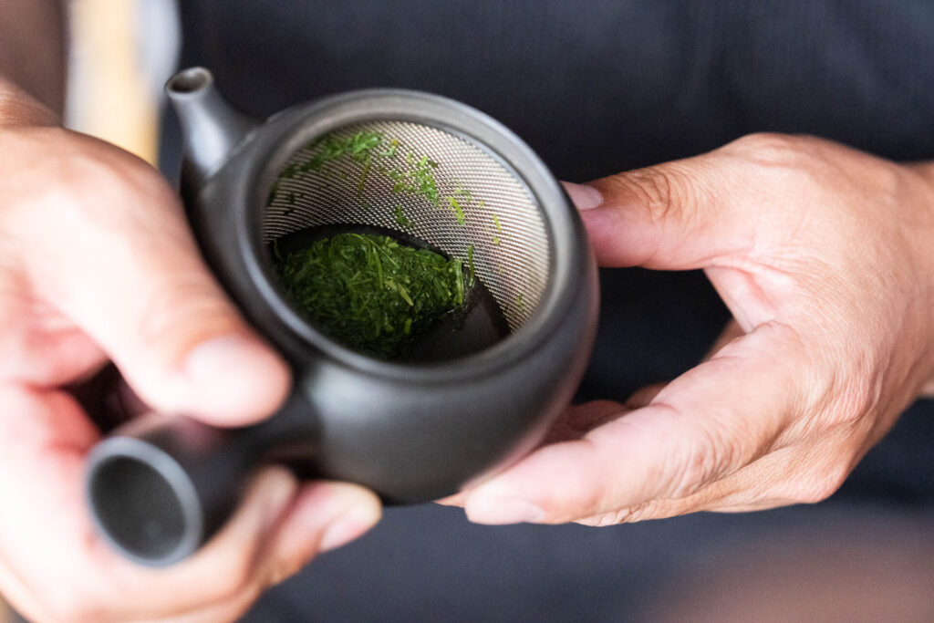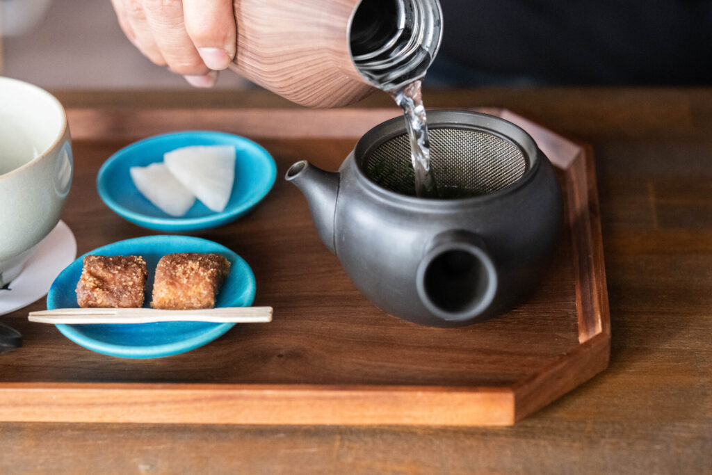 このセットの楽しみは、急須でゆっくりと味わう深蒸し茶。一煎目はおよそ70℃のお湯で茶葉を広げ、まろやかな旨みを味わえます。セットには80℃のお湯が入ったボトルも付いているので、二煎目、三煎目は好きなタイミングで。茶葉がしっかり開いた後は、蒸らし時間を短くしてもうつくしい緑色で、一煎目よりもほどよい苦みや渋みのお茶が楽しめます。