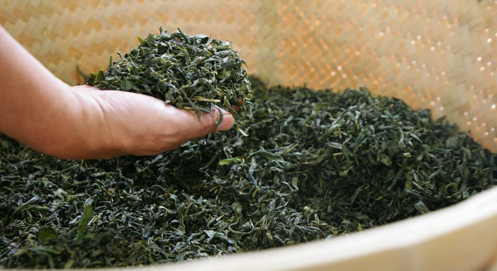 製茶の要である手もみ。日本手もみ製茶技術資格(教師補)を持つ今隈さんが、機械製茶でも茶葉の感触を確かめながら仕上げます。