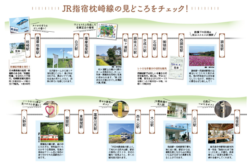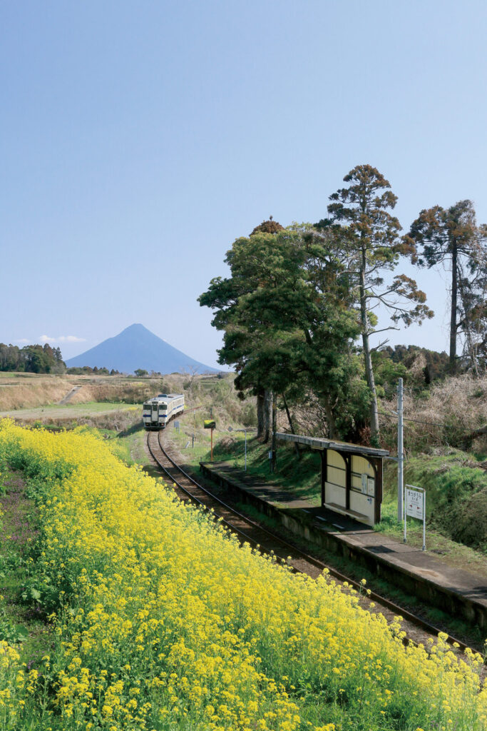JR指宿枕崎線は、指宿駅からJR日本最南端に位置する小さな無人駅「西大山駅」、そしてJR日本最南端の始発・終着駅「枕崎駅」へと続く路線です。沿線では、四季折々の草花とともに、錦江湾や桜島、開聞岳などの美しい景観を楽しむことができます。