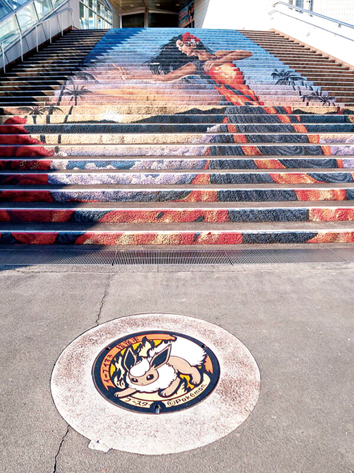 階段アート「夜明け」やイーブイマンホールなど映える撮影スポットもチェック。湯上がりに観光気分でパチリ。
