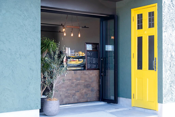 グリーンのおしゃれな外観。コーヒーやパウンドケーキ、キッシュなどテイクアウトもOK。気軽に立ち寄って。