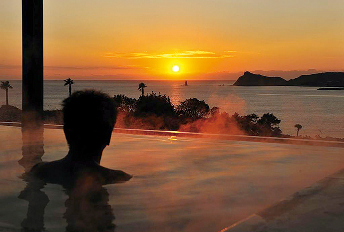 岩造りの露天風呂から東シナ海へ沈む夕日や夜景を楽しめます。ぜひ疲れを癒やして。