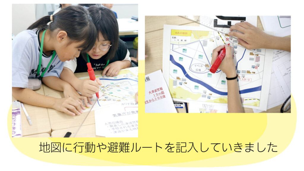 次に、地震と津波の発生時にどう行動するのかを、地図を使って班ごとにシミュレーション。地震発生直後、1分後、3分後…と、時間ごとに取るべき行動を考えていきます。「津波が来るかもしれないから高い場所へ逃げる」「まずは情報収集」「川から離れる」などと意見を出し合い、地図に行動や避難ルートを記入。命を守るためにはどうすればいいのかを話し合いました。