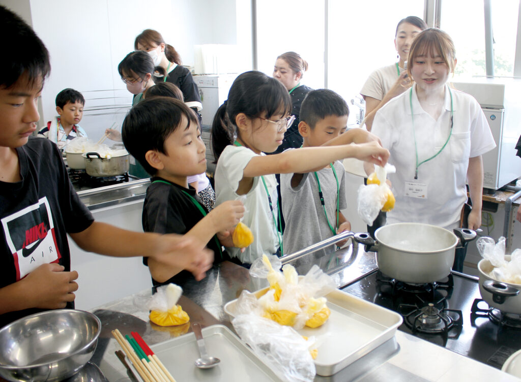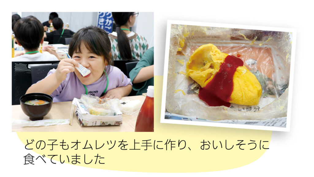 そして、フードコーディネーターであるTable of Smileの杉水流直子さんに教わりながら〝防災食作り〟。カセットコンロと耐熱性のポリ袋があれば調理できる「オムレツ」にチャレンジです。ポリ袋の中に卵やツナなどの具材を入れて混ぜ合わせ、湯せんで火を入れます。完成したオムレツを、手作りのお皿とスプーンで食べると、どのテーブルからも「おいしい!」の声が上がっていました。
