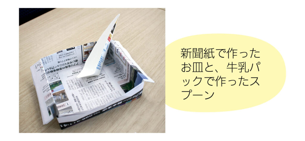 続いては、災害時の食を考える講座です。被災時は食器が割れたり、あっても断水で洗えなかったりする場合も。そこで鹿児島大学教育学部の教授・黒光貴峰さんの指導で、身近なものでできる食器作りに挑戦。新聞紙でお皿、牛乳パックでスプーンを作りました。