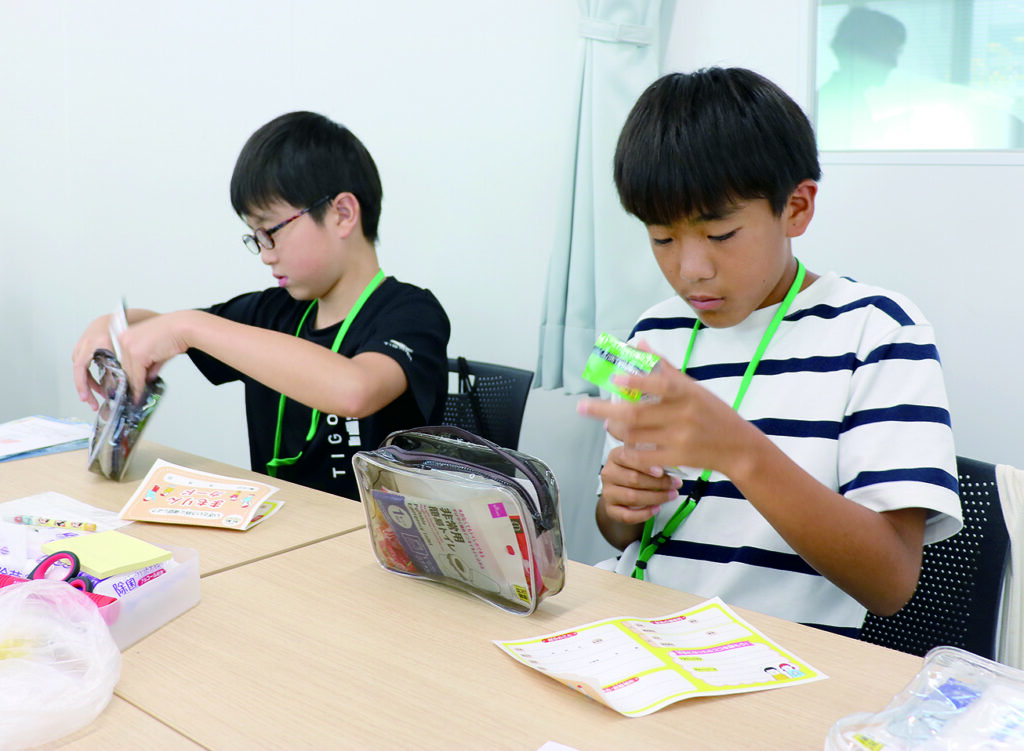 最後は、鹿児島大学の黒光さんによる授業。災害時に役立つ防災グッズを入れた「防災ポーチ」と、緊急時の連絡先や避難場所、自分の情報を記入した「まもりんカード」の作成に取り組みました。「地震は、いつどこで発生するか分かりません。学校や習い事への行き帰りなど、1人でいる時に発生する可能性もあります。ポーチやカードを持ち歩くことで、緊急時に冷静に対応する助けになります」と黒光さん。