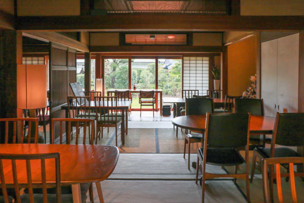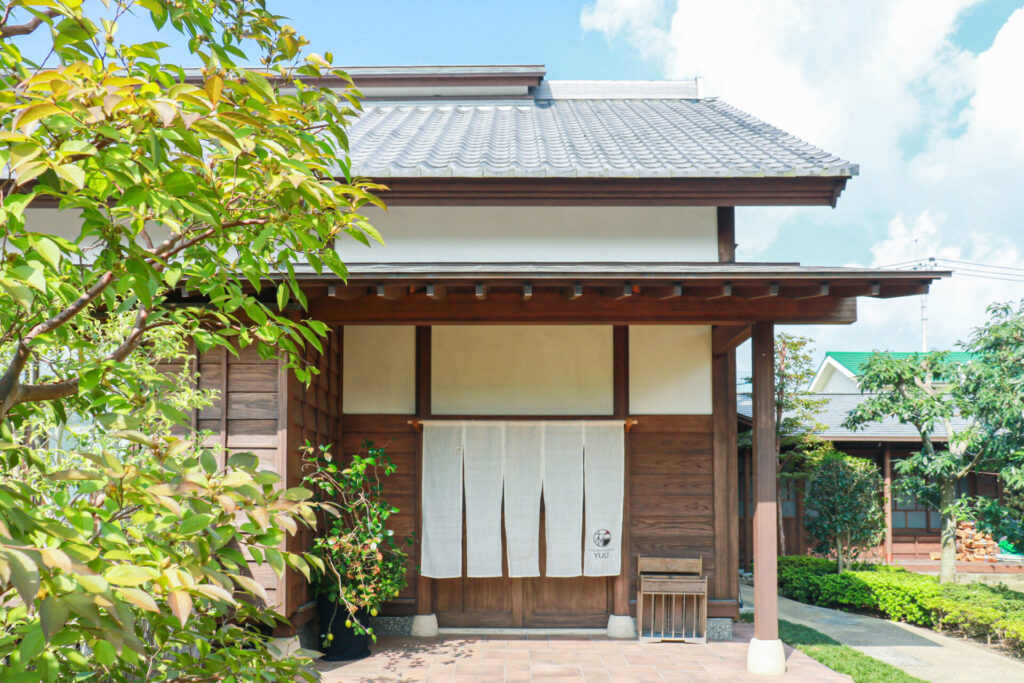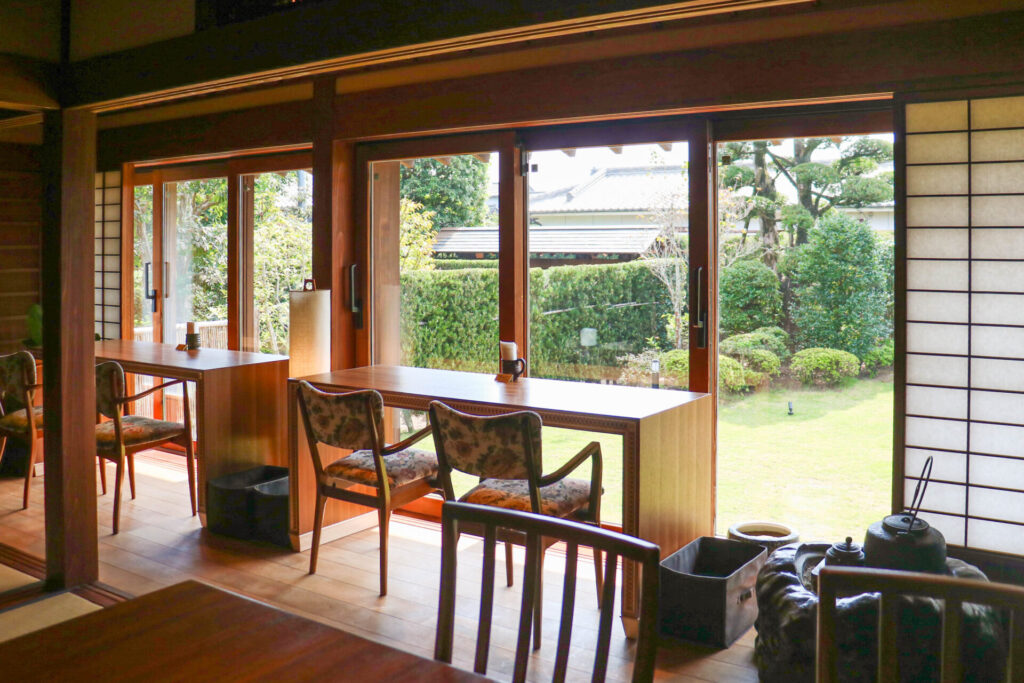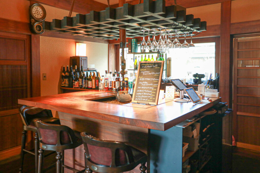 立派な門をくぐると現れるのが、大きな庭に面した和風の建物。中に入ると、広い土間や高い天井と梁(はり)、縁側から見える庭、囲炉裏のあるバーカウンターなど、上質な空間が迎えてくれます。
