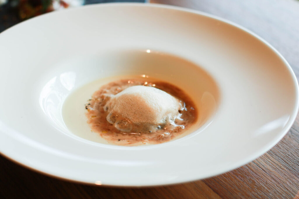 タマネギとサツマイモの冷製スープには、ふわふわに泡立てた、コーヒーミルクを提供する直前にのせます。温度差で泡がゆっくりと溶けていき、ほんのりとしたコーヒーの苦みがアクセントに。