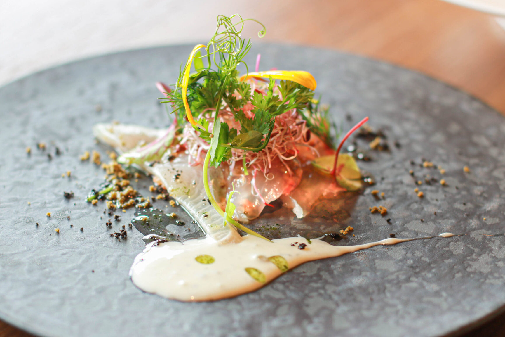 季節のサラダの後はオードブル。季節の魚・カンパチを使ったカルパッチョには、イタリアンソースの他、なんとブルーチーズソースも添えられています。意外な組み合わせですが、新しい味に出会えるのも創作料理ならでは。