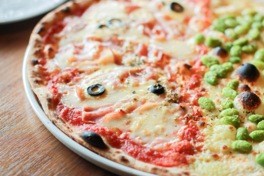 「ローマピザは具材を楽しんでもらうピザ。トッピングするたっぷりの具材はもちろんですが、それぞれの具材に合わせてピザソースも手作りしています」と起也さん。この日は旬のエダマメとマルゲリータのハーフ&ハーフをチョイス。エダマメの食感としっかりとした風味を感じました。