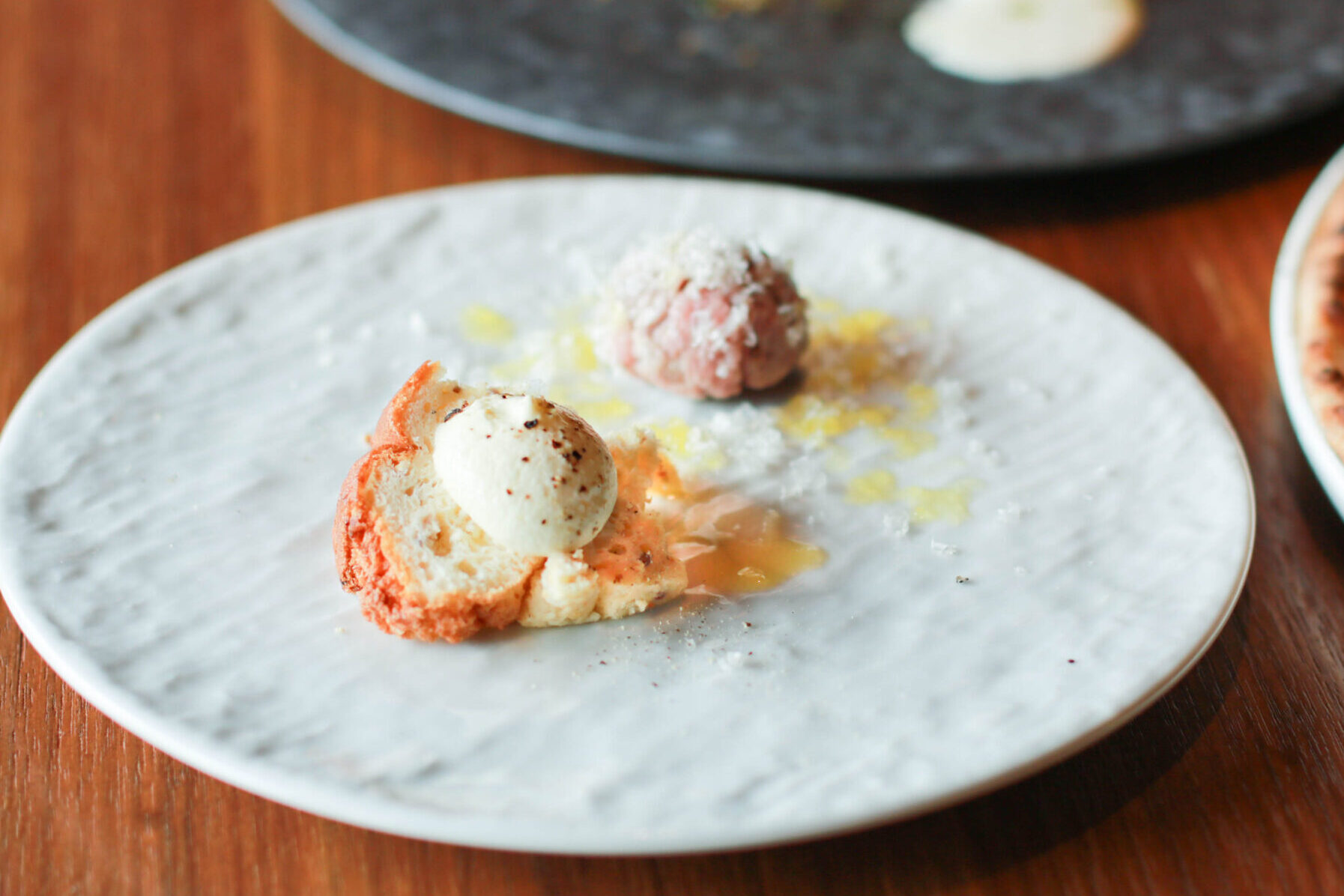 その横にある「牛肉とパルメザンチーズのタルタル」は、たたいた牛肉とパルメザンチーズを合わせ、低温調理で仕上げた一品。素材の味が引き立っていました。