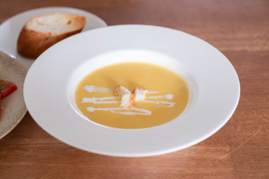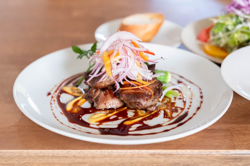 「国産豚ホホ肉のコンフィ 赤ワインのカラメルビネガーソース」は、72℃のラードで5時間じっくり煮込み、提供直前に香ばしく焼き上げた一皿。脂身が少なく、しっかりとした肉質を生かしたホホ肉は、やわらかでありながらも噛むほどに旨みが広がります。