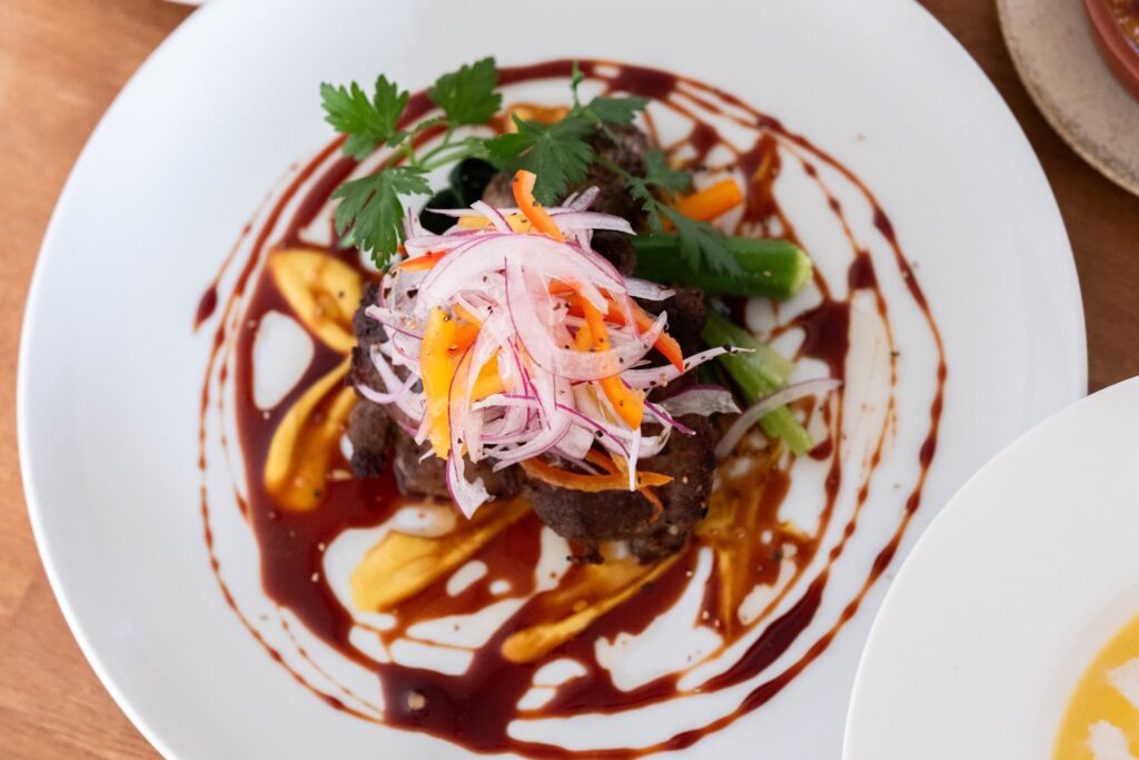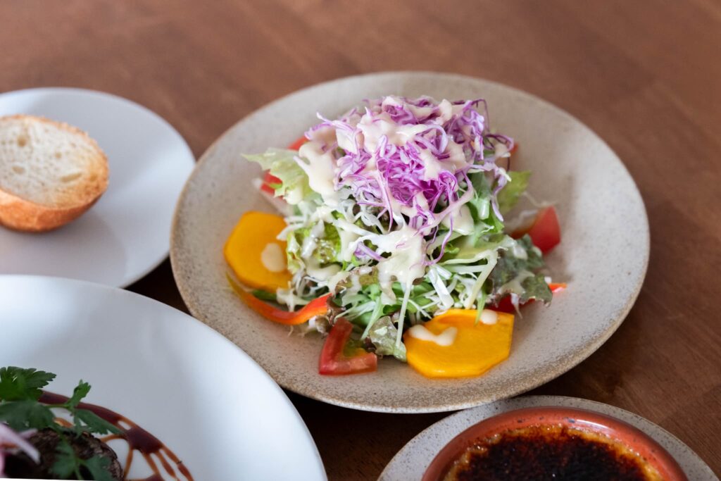 添え野菜は里芋、ピーマン、オクラ、そして肉の上に彩りを添える紫たまねぎ、パプリカ、柿が。いずれも地元で採れた旬の野菜で、料理に季節の彩りと味わいを添えていました。