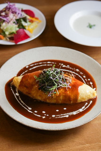 「霧島卵のオムライス」は、ふわふわの半熟卵。たまねぎ、鶏肉、ピーマンをバターライスとともにケチャップで炒め、やさしく包み込みこんでいます。仕上げにかかる自家製デミグラスソースとの相性が抜群です。
