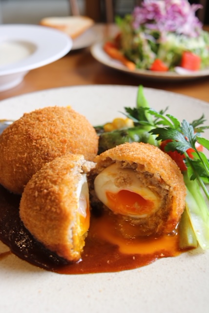 霧島産の卵を使った「スコッチエッグ」は、タイムやバジルなどのハーブとスパイスを混ぜた合いびきミンチで半熟卵を包み、衣をつけてカラッと揚げた一品。