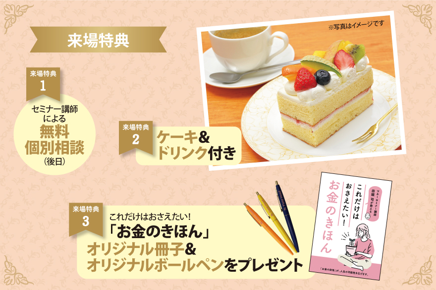 参加費は無料、ケーキ&ドリンク付き。来場特典でセミナー講師 田頭さんによる無料個別相談(後日)、オリジナル冊子・ボールペンをプレゼント。