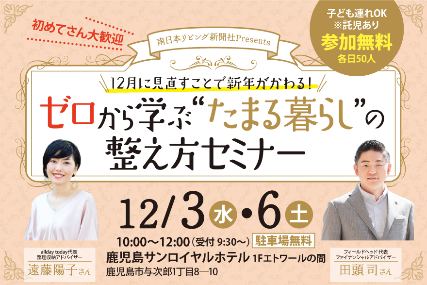 「ゼロから学ぶ〝たまる暮らしの整え方〟セミナー」12月3・6日に鹿児島サンロイヤルホテルで開催