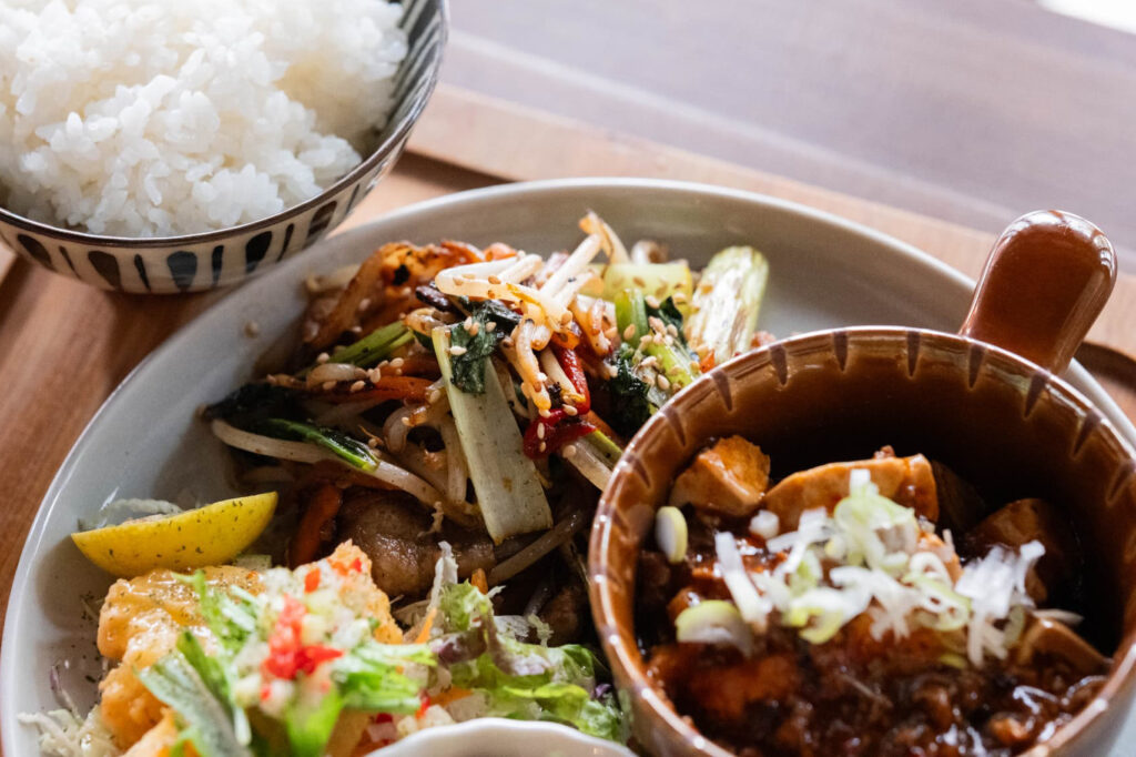 このときのメニューは、Aピリッと旨辛「豚キムチ定食」、Bサクふわ仕上げ「魚のフリット チリマヨソース」、Cやみつき注意「麻婆豆腐」。どれか一つに選べないということで「全部ちょい盛り!満腹ランチ」をいただきました。