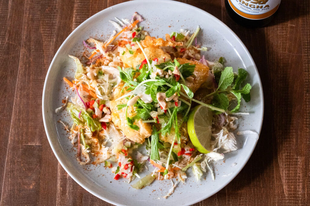 夜に提供される「白身魚のスイートチリソース」は、衣はサクッと軽く、身はふんわりとやわらか白身魚フライの上に、クミンが香るにんじんのなますと、甘酢に漬けたたまねぎ・きゅうり・赤ピーマン・レッドキャベツをカットしてトッピング。さらに、フレッシュな水菜と豆苗、ミントとライムを添え、彩りも香りも豊かな仕上がりです。皿の縁には、カレーとチリをブレンドしたオリジナルスパイスをあしらい、組み合わせで味の変化が楽しめる一皿です。