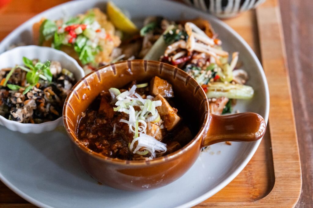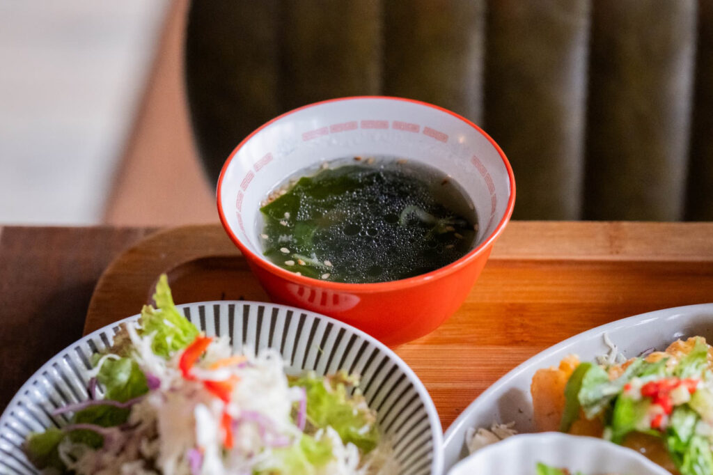 この日のスープは、「わかめスープ」。鶏を煮て一晩寝かせた出汁と、野菜をじっくりと煮込んだ出汁。そこに、宮内さん秘伝のタレを合わせることで、まろやかさの中にコクと香ばしさが生まれています。口に含んだ瞬間にじんわりと広がる深い旨み。わかめのやさしい塩気が、飲み進めるほどに体に沁みわたるような味わいです。主菜を引き立てながらも、思わずおかわりしたくなるおいしさ。ぜひ、味わってみて。
