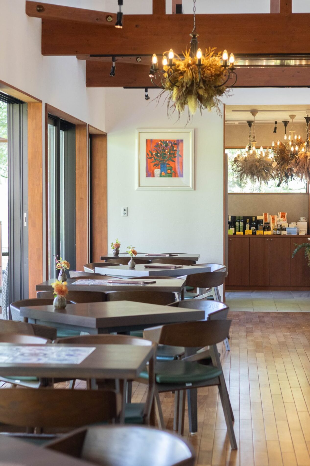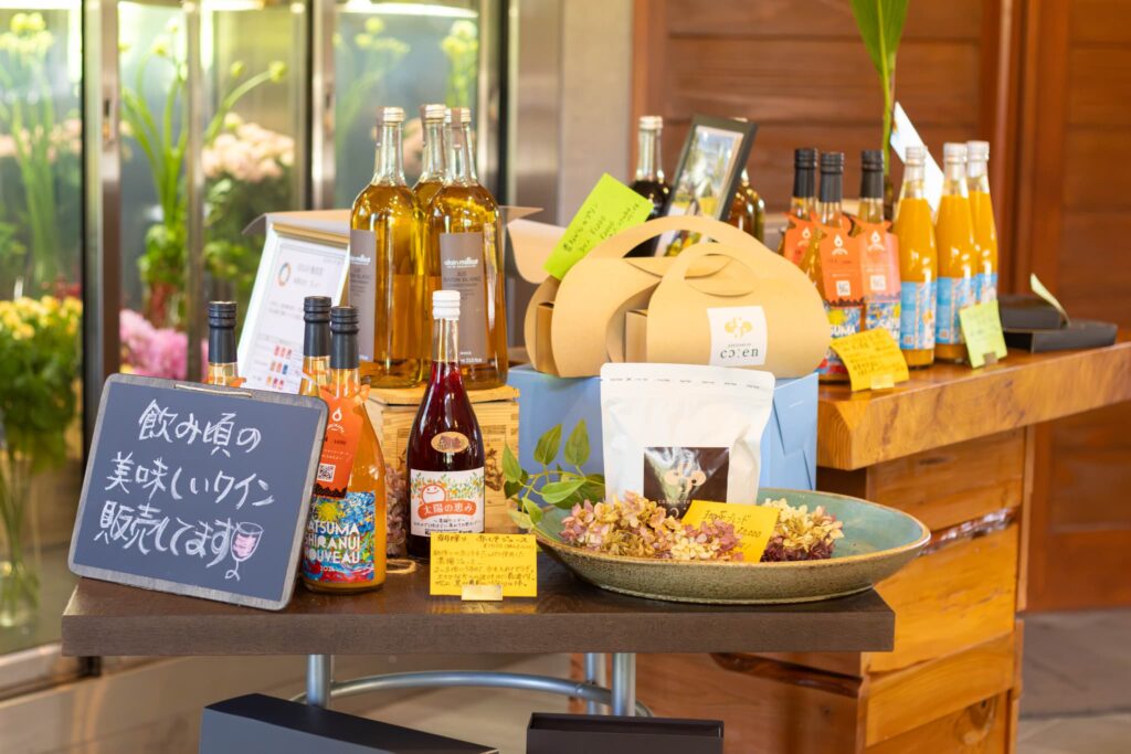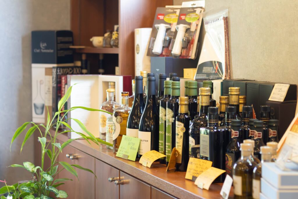 入り口近くには、カフェで使われている調味料やカップ&ソーサーのセット、ギフトにぴったりな蒸留酒、オーガニックジュースなどが並ぶ物販コーナーもあります。