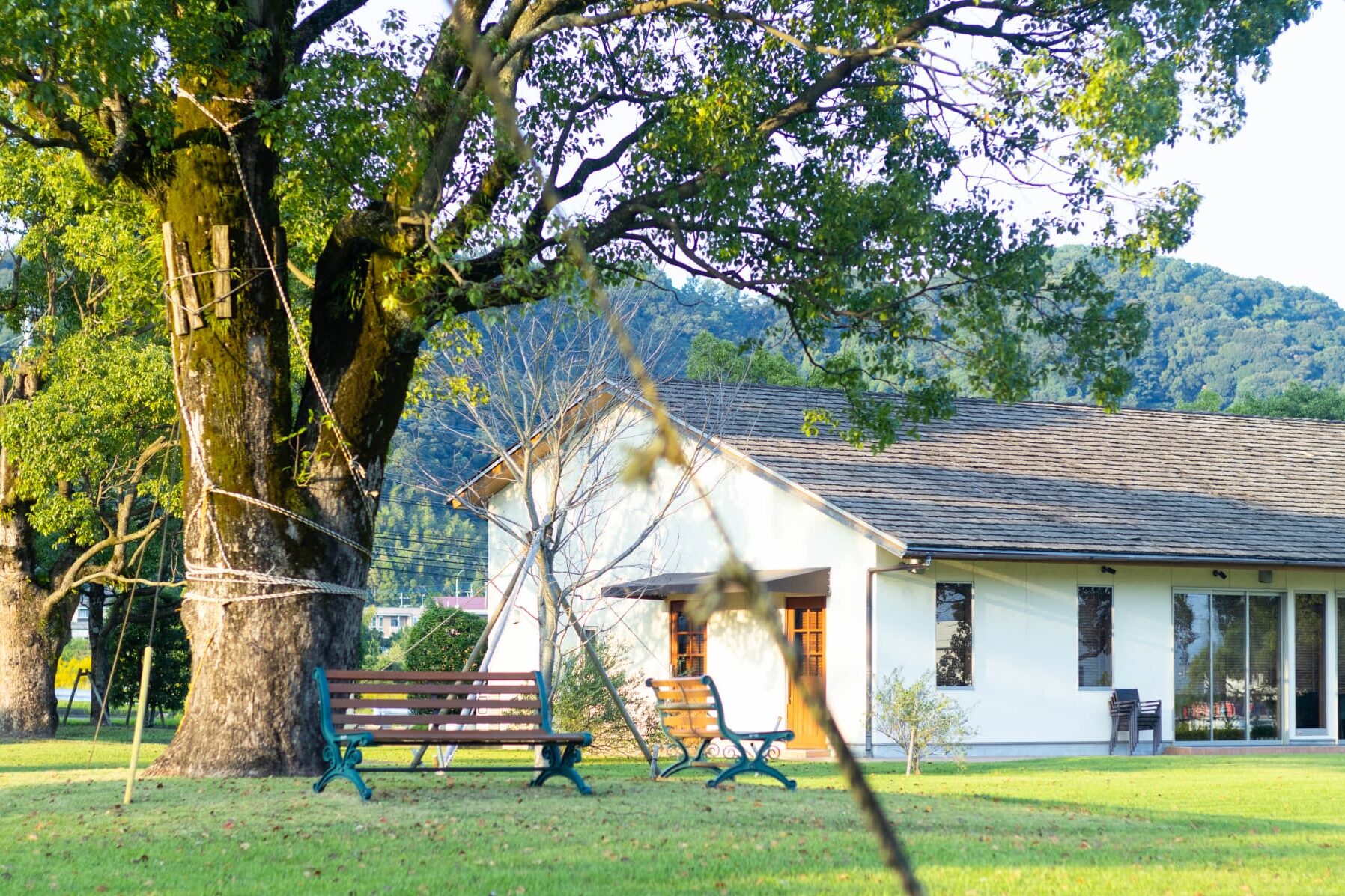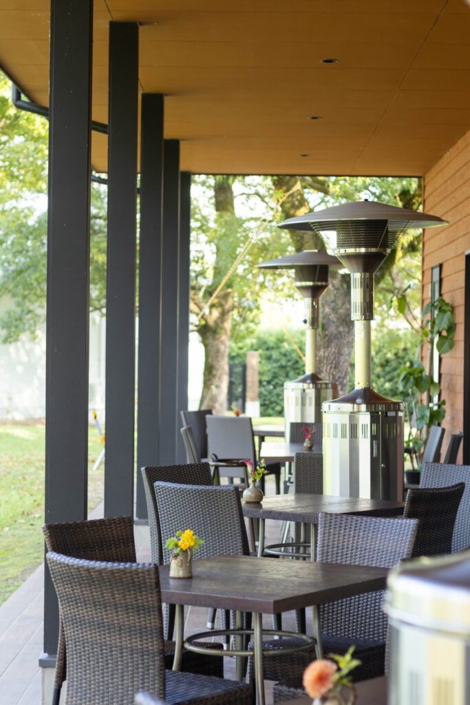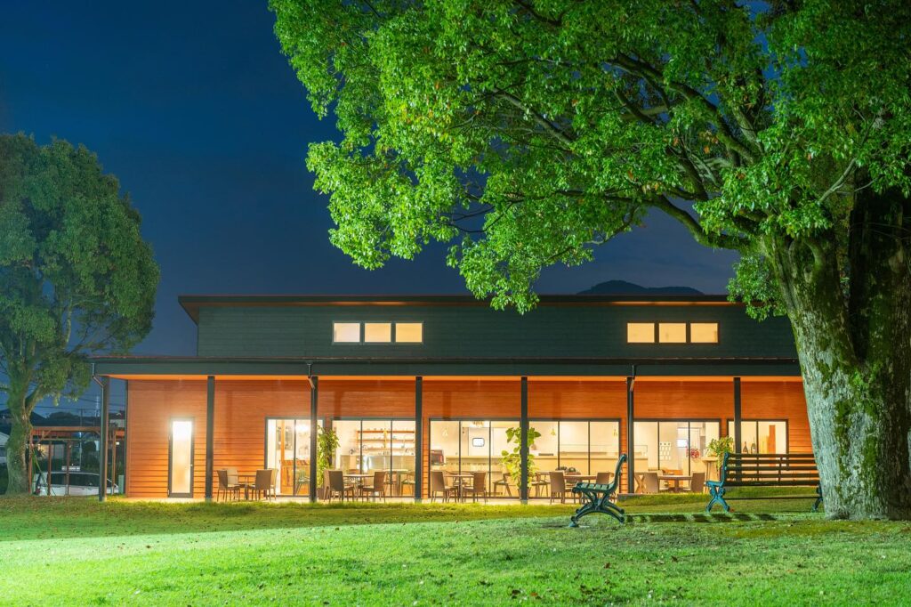 お店の周辺には芝生が広がり、その芝生を望む黒と茶色の建物が「アトリエ珈苑」。外の景色をぼんやりと眺めながら、日常の慌ただしさを忘れられる穏やかな時間が流れています。