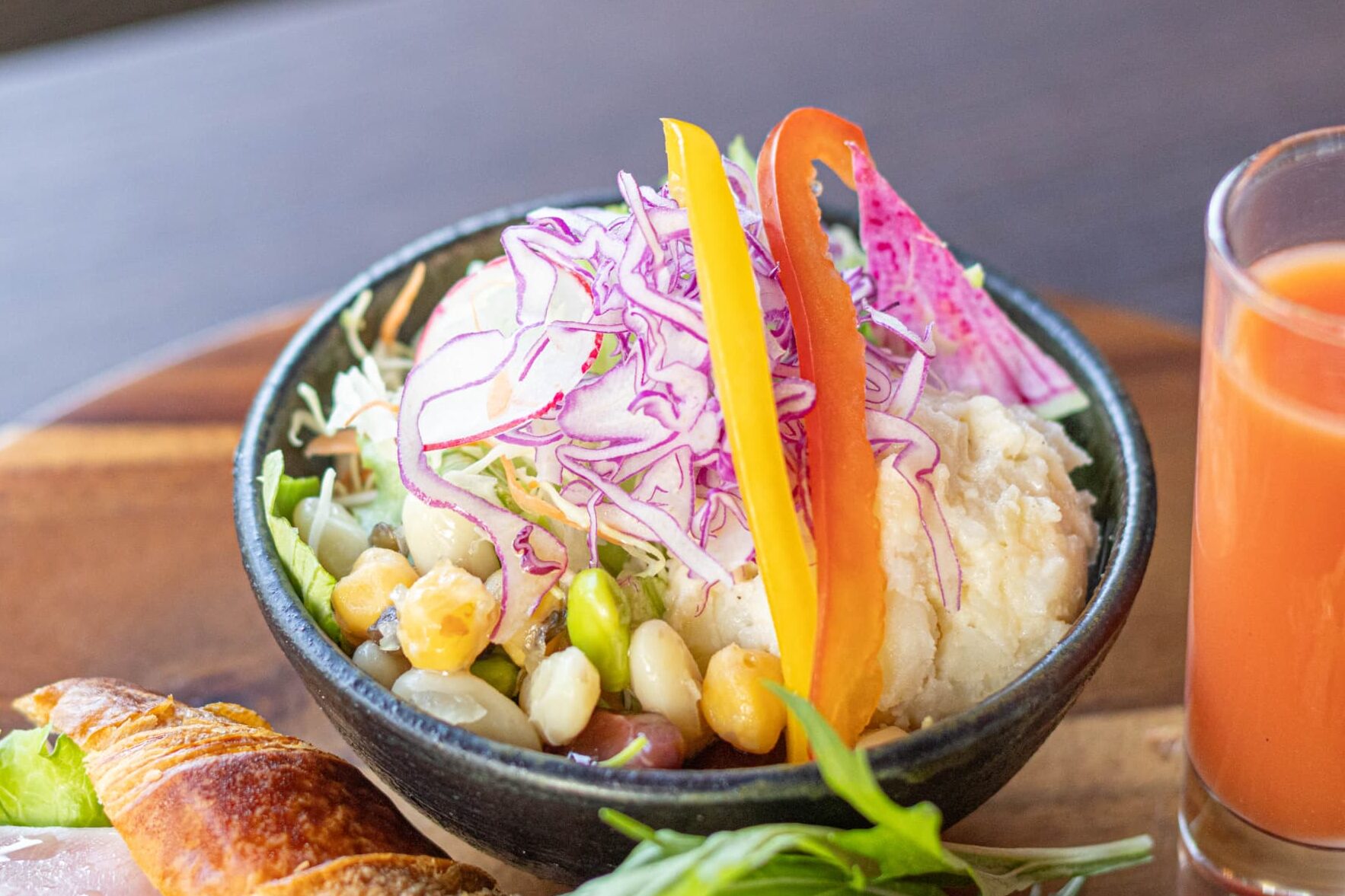 朝の時間帯は、「ベーコンエッグプレート」と「クロワッサンサンド」の2種類のモーニングセットを提供しています。今回は「クロワッサンサンド」をいただきました。クロワッサンサンド、キッシュ、サラダ、ブラッドオレンジジュースのワンプレートと、自家焙煎のコーヒーまたは紅茶、季節のミニパルフェが付いた、充実の内容です。