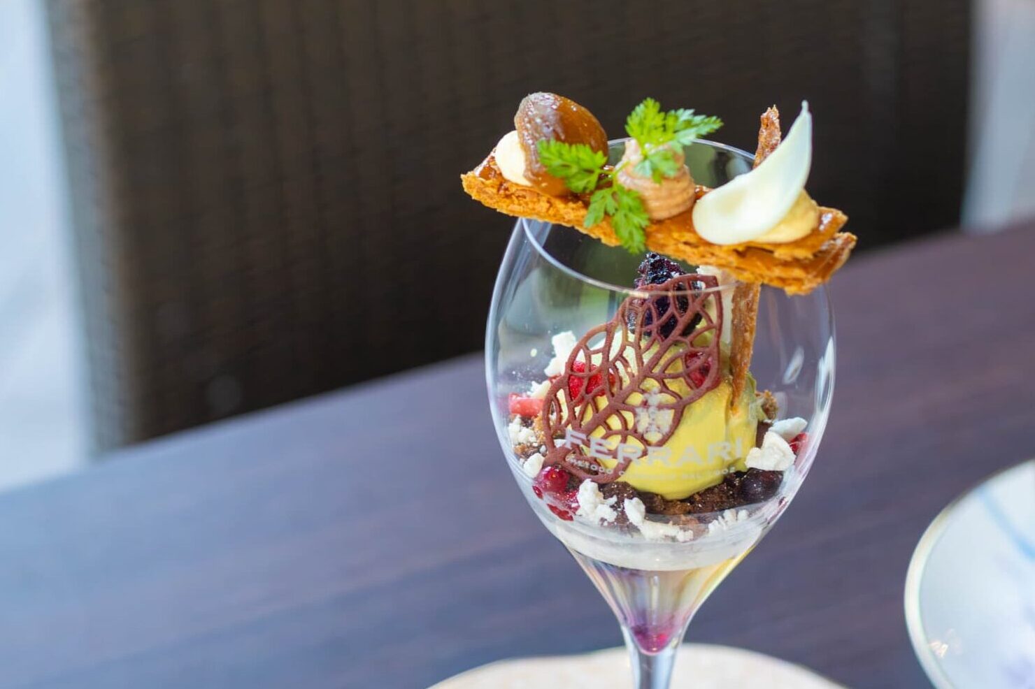 ぶどうゼリーやココナッツパンナコッタの層の上には、ピスタチオのジェラート、クラッシュしたメレンゲやショコラケーキ、繊細なリーフ状のクッキーが。