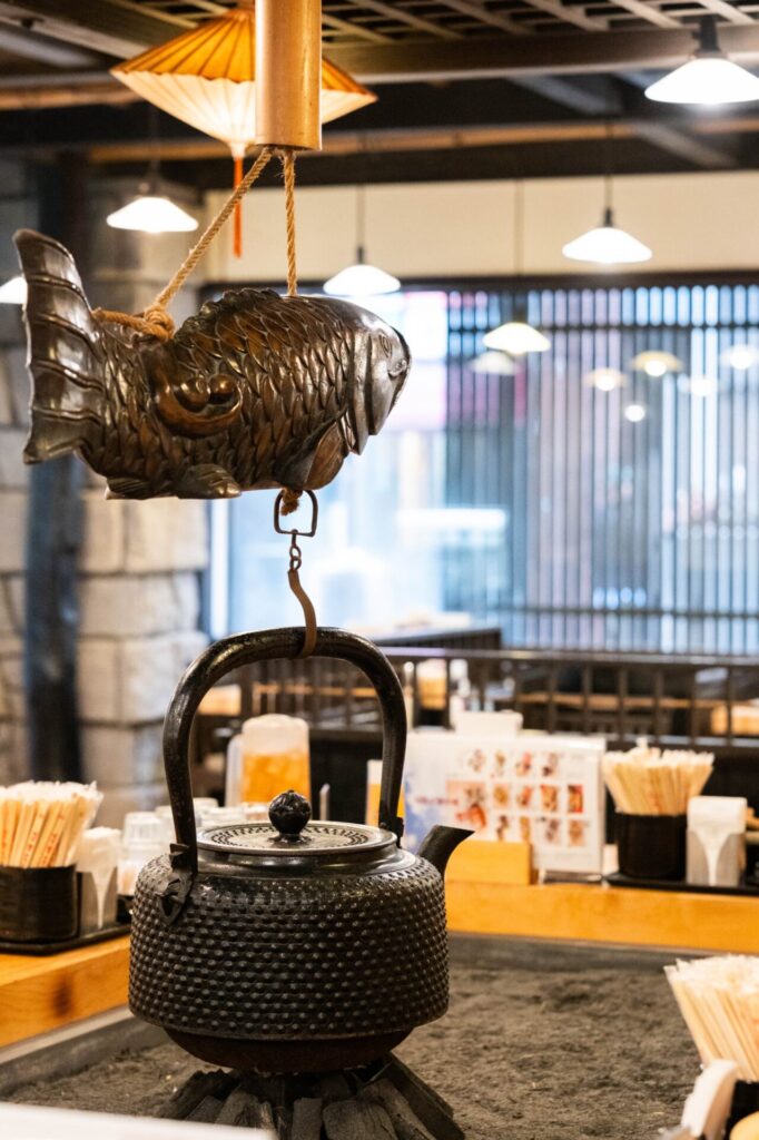 店先には赤い和傘や畳の長いすが置かれ、アーケードの中でも思わず足を止めてしまうほど和の趣が漂います。店内は、コンパクトながら囲炉裏があり、どこかほっと落ち着く雰囲気はそのまま。