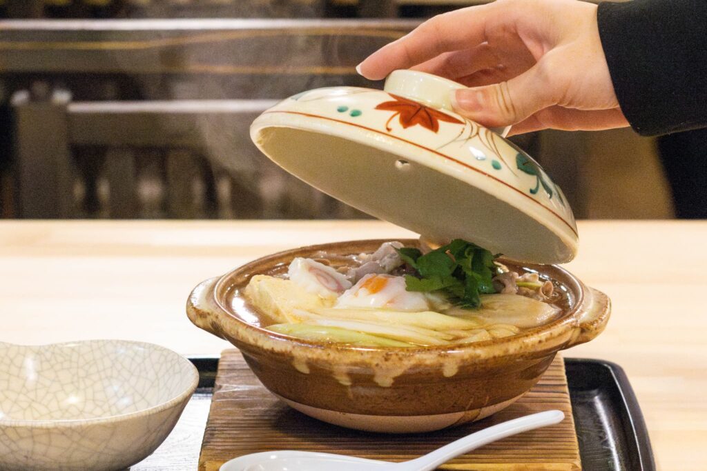 煮込むことで豚肉の甘みがつゆに溶け込み、味噌のまろやかさが一層深い味わいに。熱々の土鍋から取り皿に具材とつゆを移し、はふはふと食べるのも土鍋ならではの楽しみ。半熟卵の黄身のコク、みつばの爽やかな香り、おもちや豆腐の食感…。一つの鍋の中に、さまざまなおいしさが詰まっています。