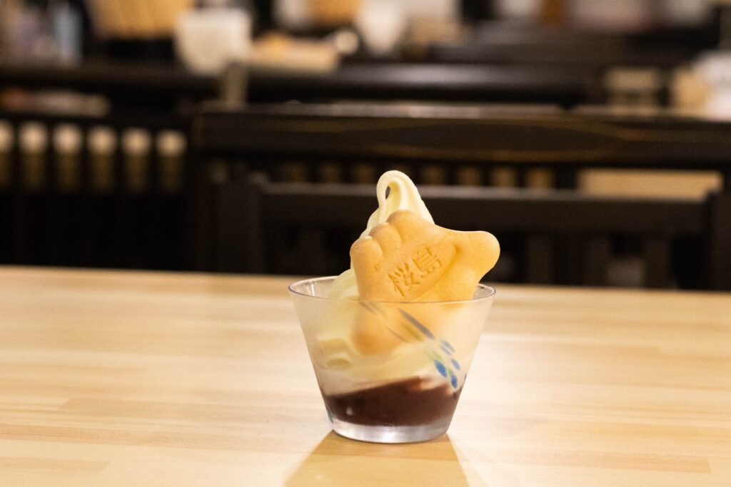 濃厚なミルクソフトの下には、北海道産の上質な小豆を使った餡。さらに、桜島を模したパリッと香ばしい最中の皮と合わせると、食感の対比も楽しい一品です。